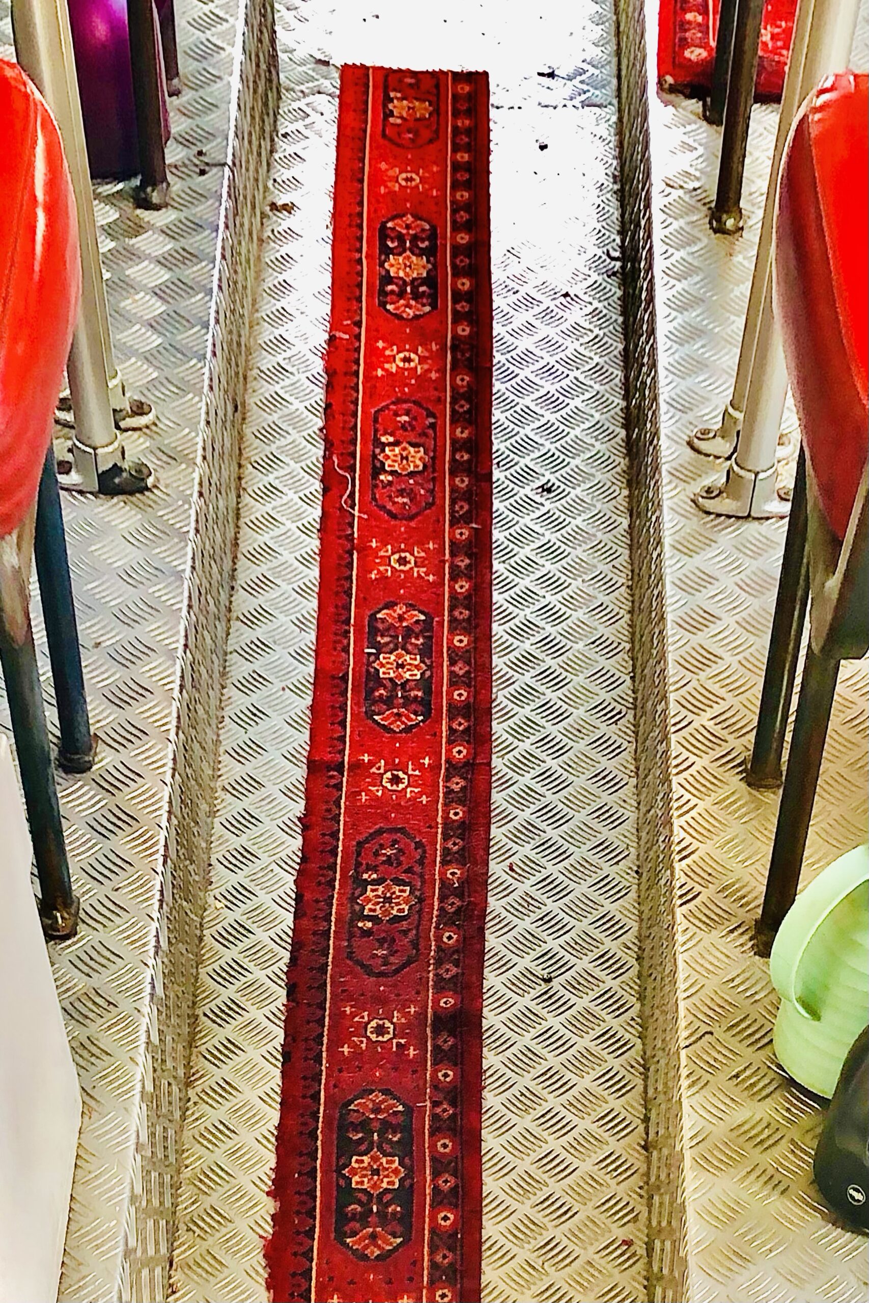 jetzt hat elias diesen teppich akribisch in einzelteile zerschnitten – er ist ja bildhauer – und dem OMNIBUS damit einen morgenländischen touch hinzugefügt, der auch mich überzeugt.
