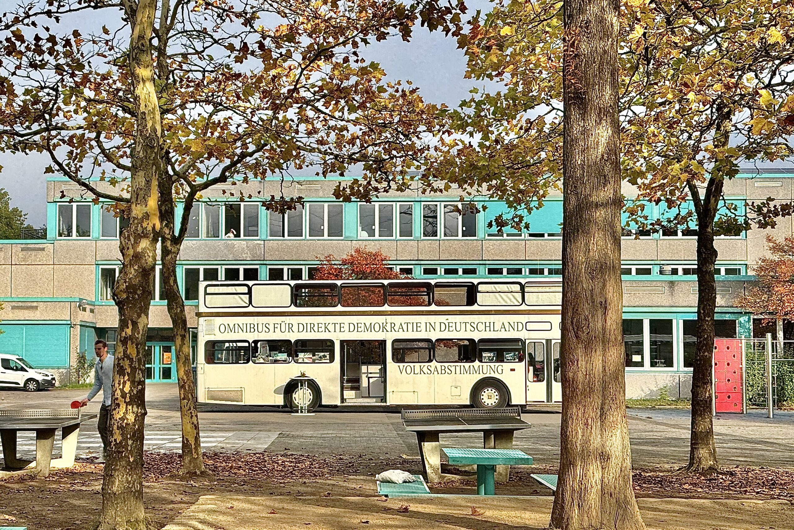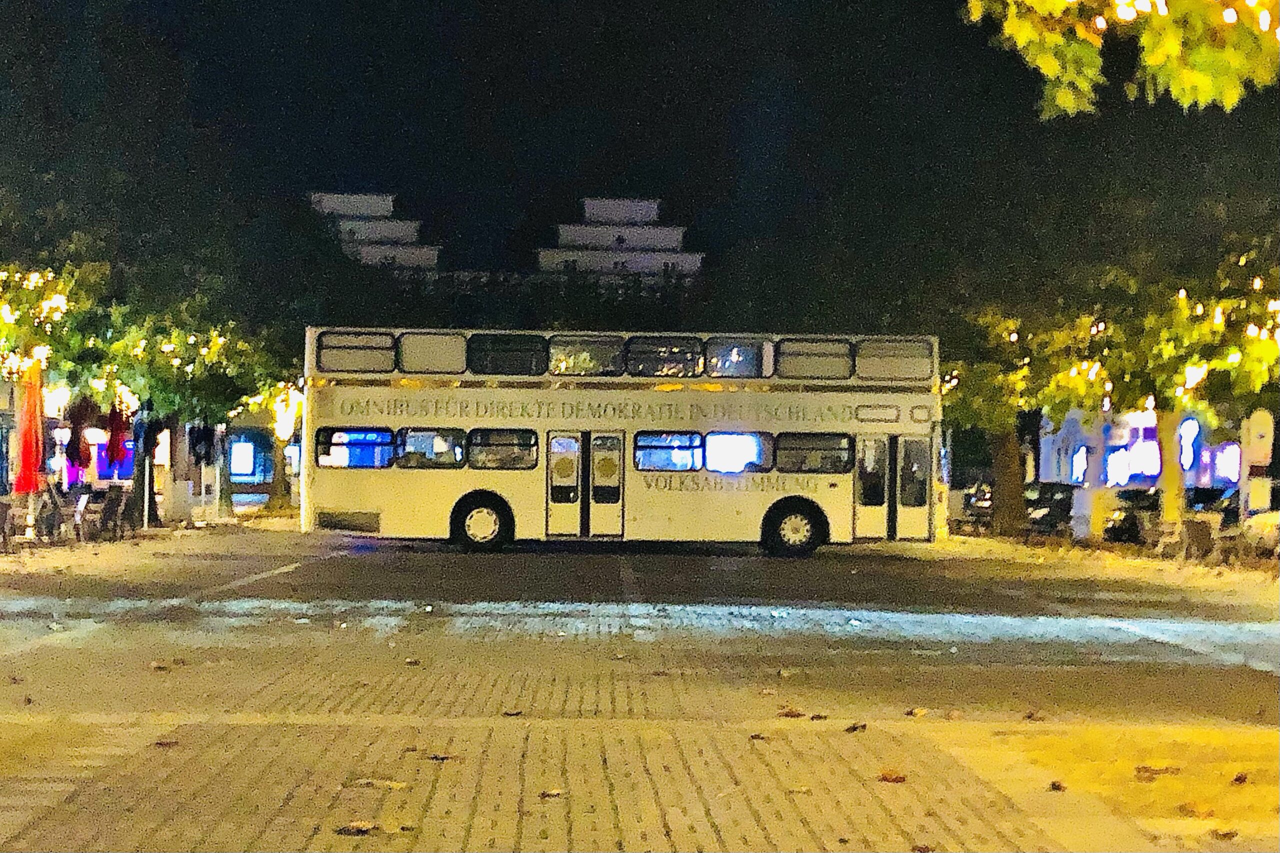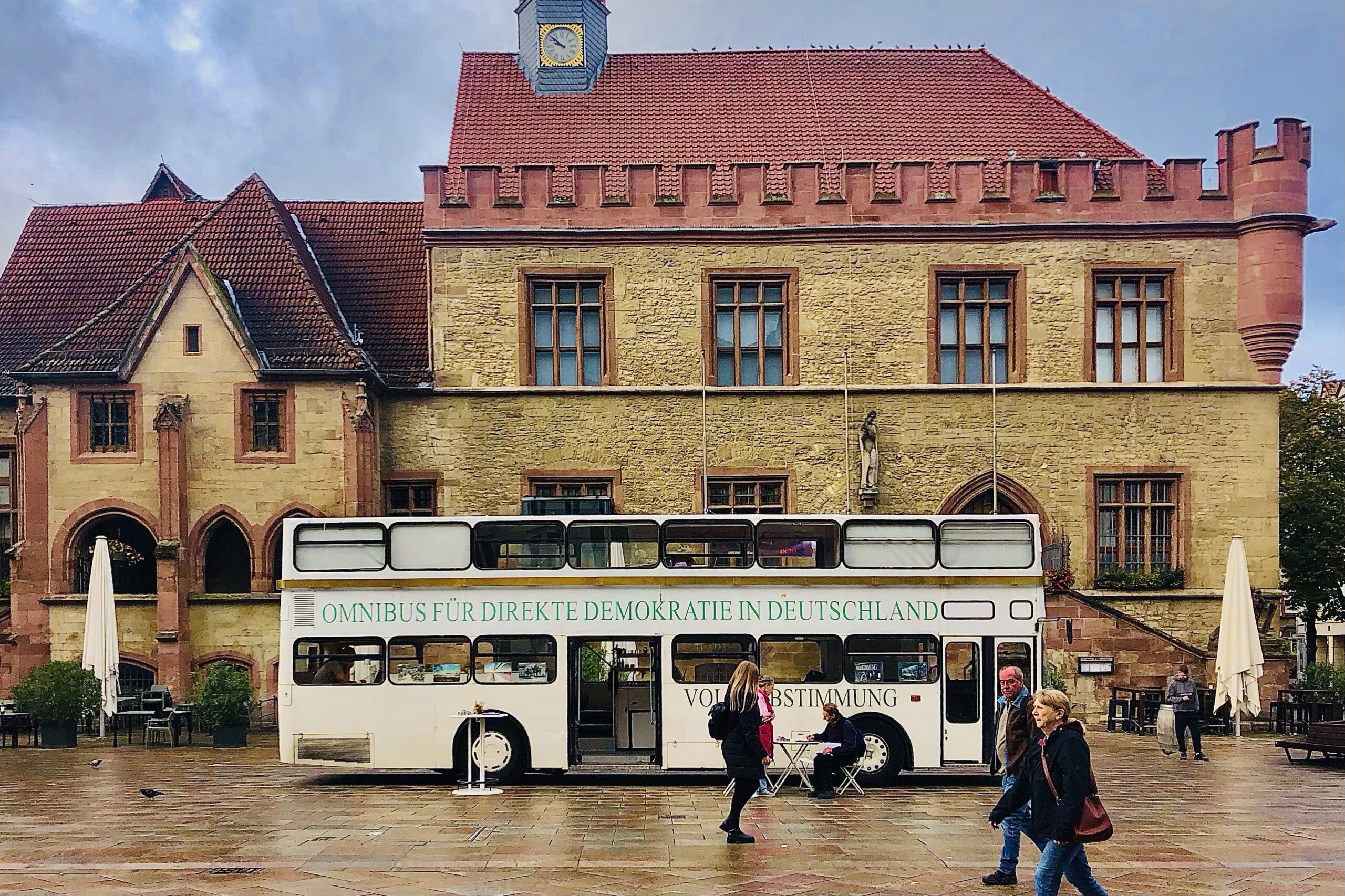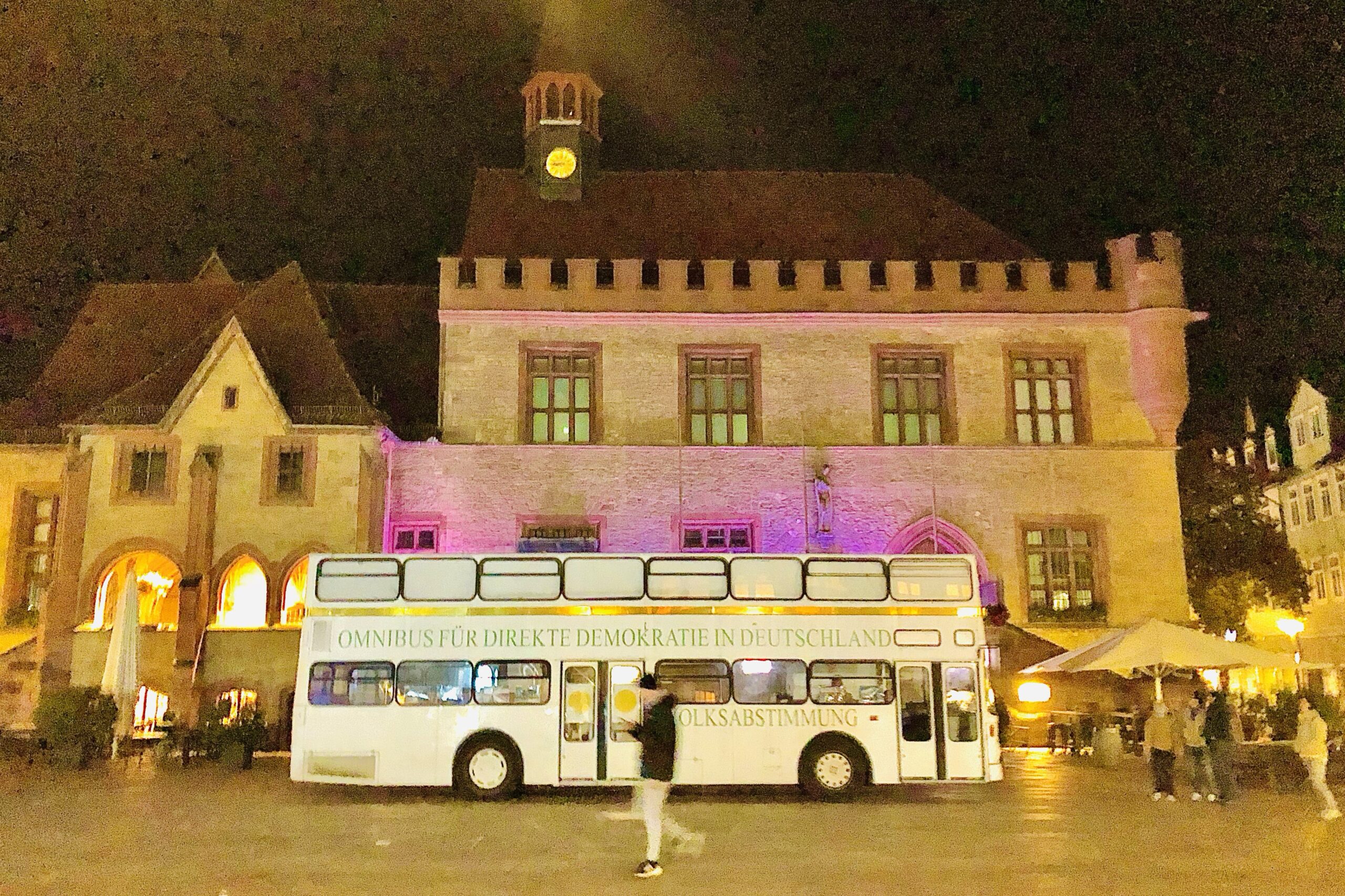 in der ersten nacht hatte ich durch das klappfenster neben meinem schreibtisch ein langes & intensives gespräch mit einem mann, der seine wohnung in einem altehrwürdigen haus gegenüber hatte und unbedingt wissen wollte, was wir machen. es erwies sich, daß er schweizer war und als dozent an der juristischen fakultät arbeitete. er war ganz begeistert vom OMNIBUS und hat bekannt, daß es ihm aus seiner fachmännischen perspektive völlig unverständlich sei, auf welch niedrigem niveau in deutschland über direkte demokratie geredet wird. das sei ihm aus der schweizer perspektive überhaupt nicht bewußt gewesen – er habe deutschland für eine „normale“ westliche demokratie gehalten. durch einen todesfall in der familie konnte er nur einmal kurz tagsüber vorbeikommen. ich habe ihm jedenfalls das buch von gertrude lübbe-wolff gezeigt.