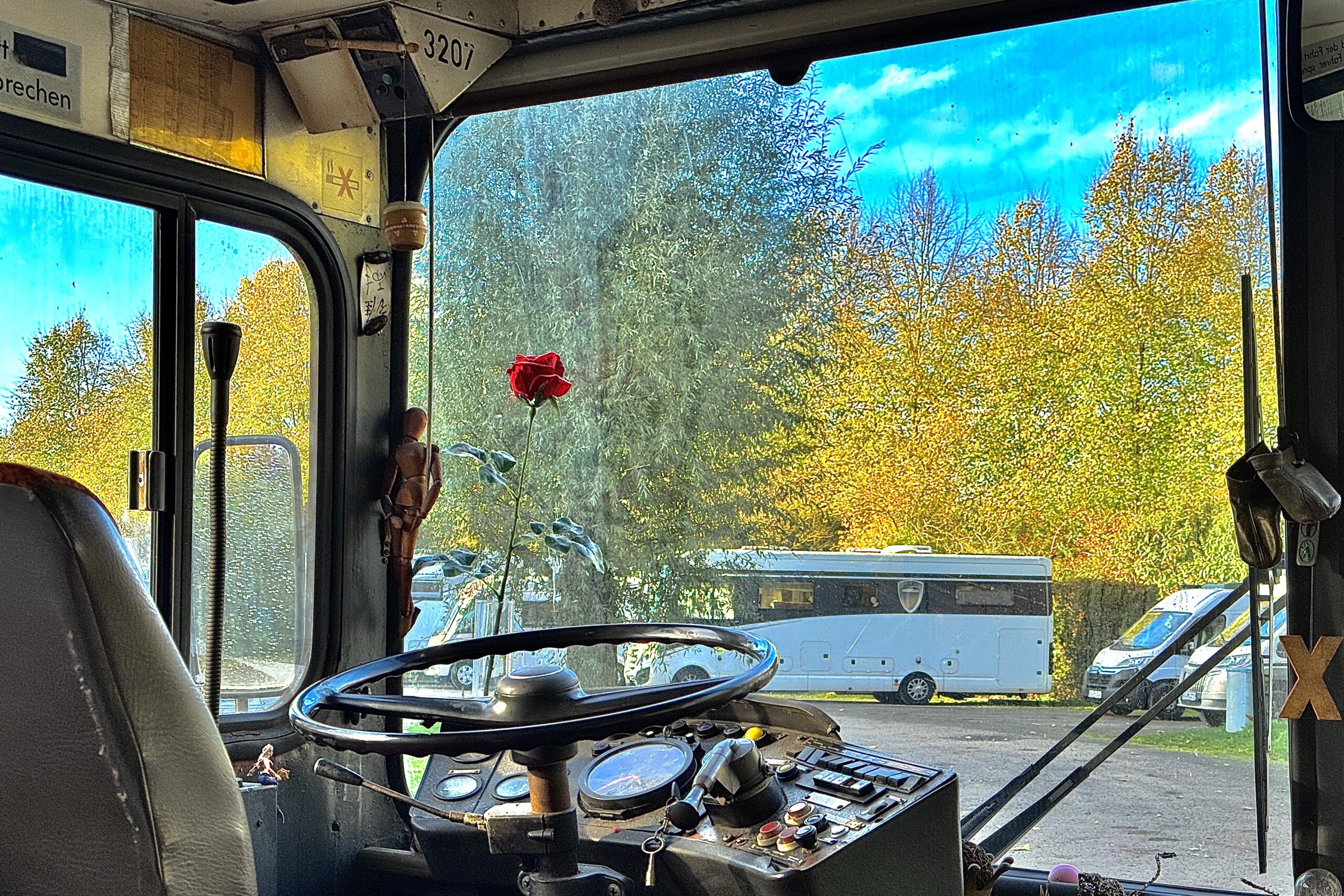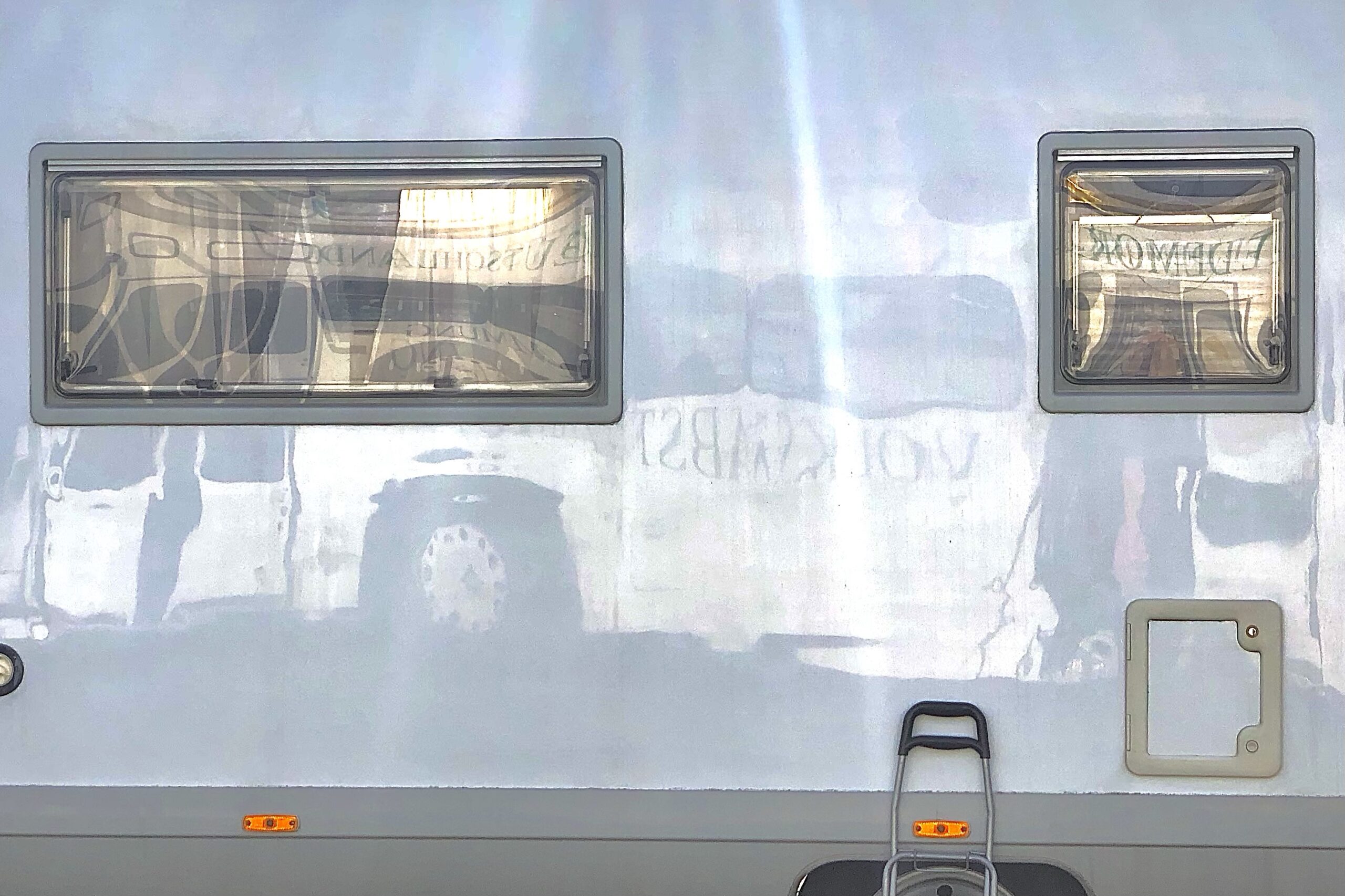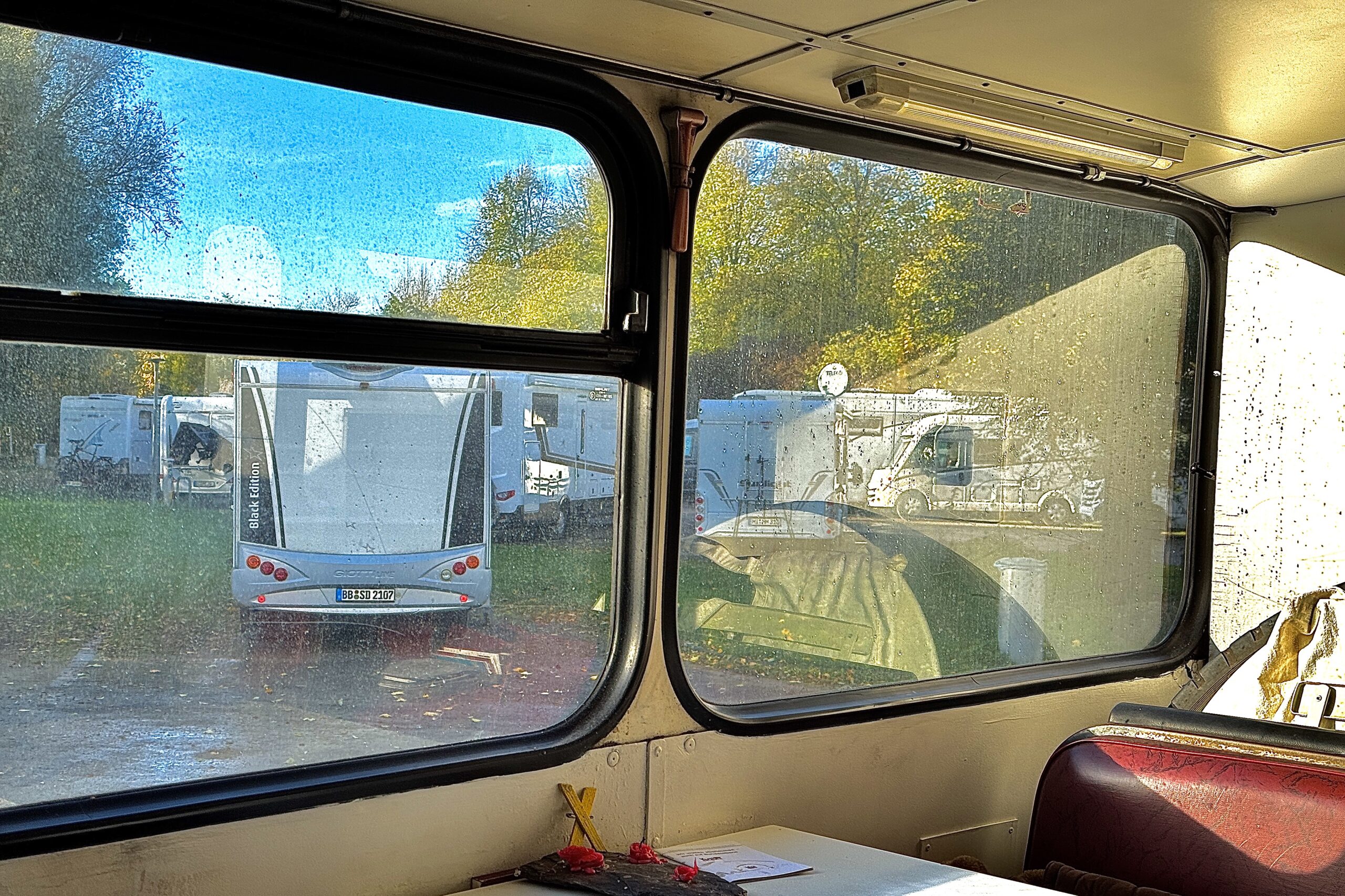 als wir bei einbruch der dunkelheit ankamen und nachdem elias sich umständlich eingefädelt hatte, kam ein selbsternannter platzhirsch und reklamierte, daß wir (bei kaltem nieselwetter) seine „veranda“ blokkieren würden. ein anderer wohnmobilfahrer hatte das ganze beobachtet und uns ermuntert, daß wir uns quer vor seinen wagen stellen – er würde sowieso nicht weg fahren. er hat sich als afd-wähler geoutet und war sehr an unserer arbeit interessiert – am ende hat er uns einen zwanzig euro schein zugestekkt und damit eine übernachtung spendiert.