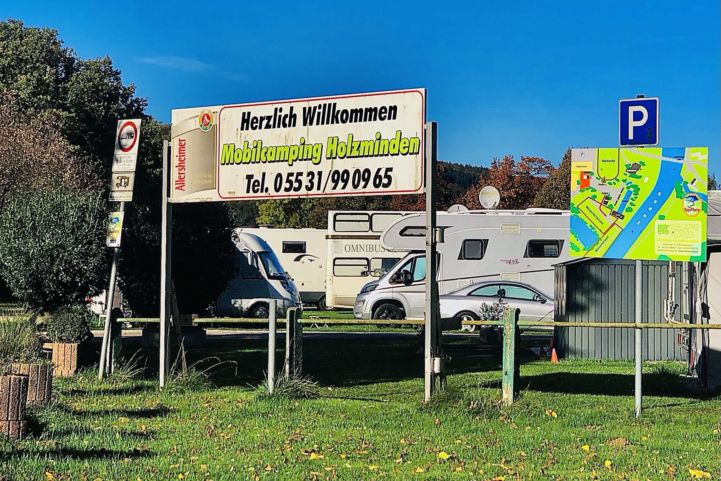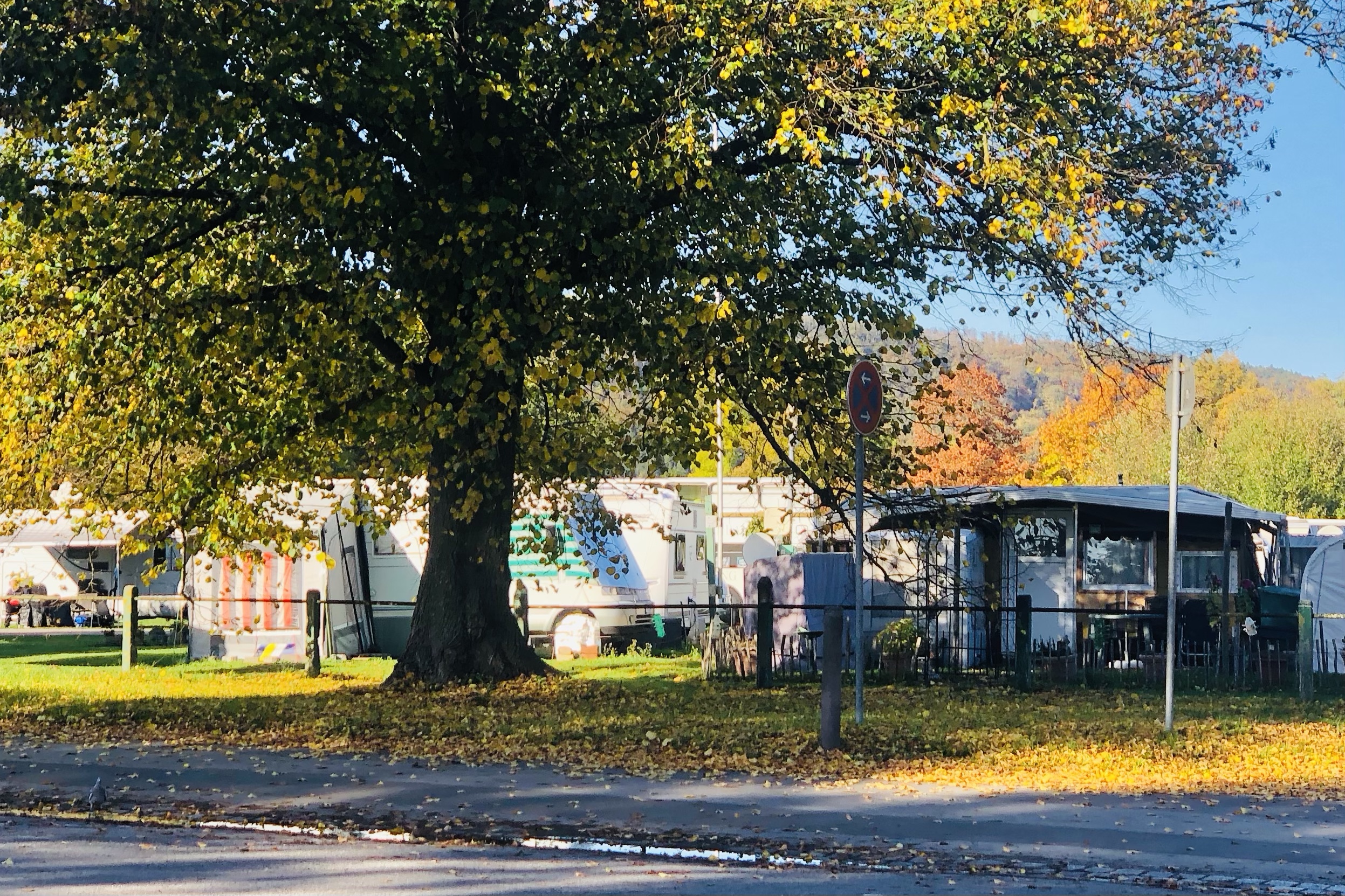 am wochenende sind wir einfach in holzminden geblieben und auf einen campingplatz jenseits der weser gefahren. da konnten wir wäsche waschen, wasser lassen, wasser auffüllen, duschen und sogar zwei neue gasflaschen kaufen. die jungs sind zwei mal in die weser gesprungen. es war zwar nachts sehr kalt, aber tagsüber schien warm die sonne wie in einem kurzsommer. bei jeder wolke kam es zu einem kurzen winter. vom farbspiel her ist der herbst sehr schön.